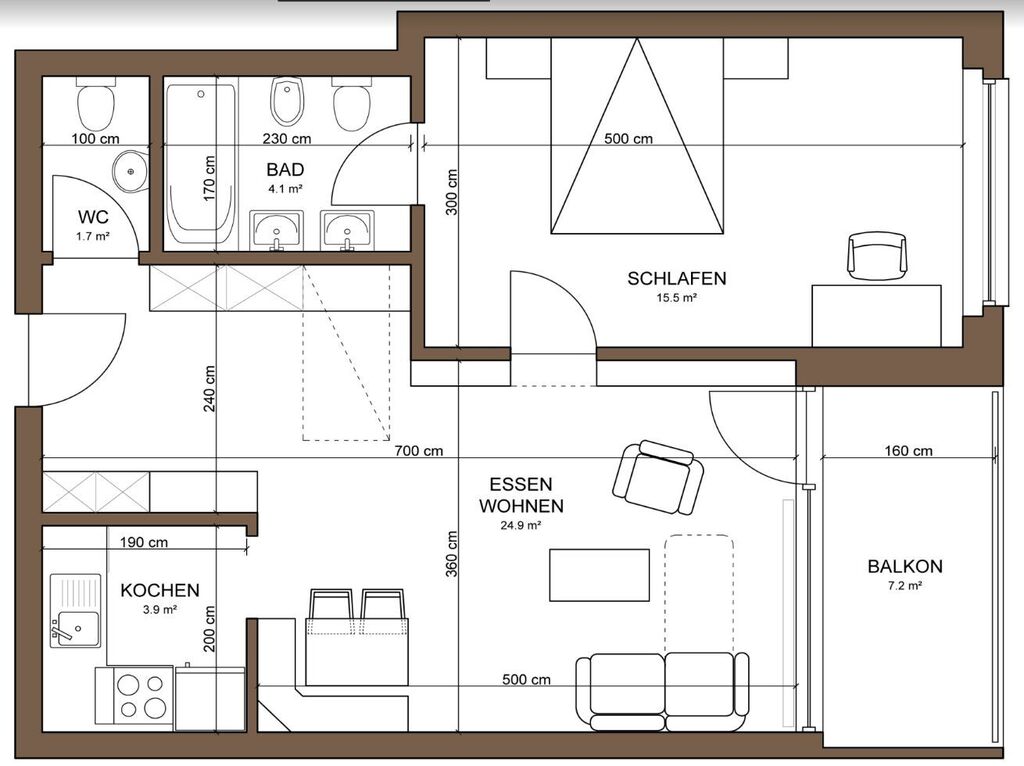 Each apartment has a bedroom with a double bed, a bathroom with bathtub, a living room with a foldable double bed and, possibly, an additional bed, kitchen, separate toilet and a balcony with mountains view.
